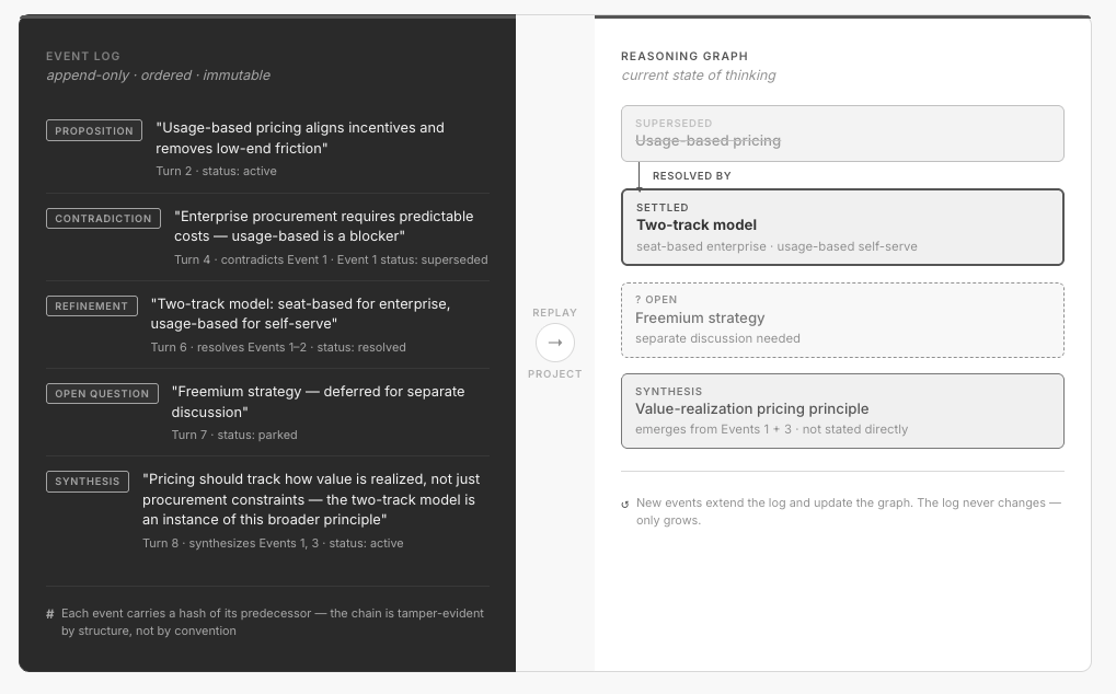 This produces two persistent data structures. The first is the event log, the append-only, immutable ledger of every typed cognitive event, in order. The second is the reasoning graph, a derived structure where each node represents an idea or position, edges represent the typed relationships between them (contradicts, refines, synthesizes), and every node carries a status computed from the full chain of events that touch it.