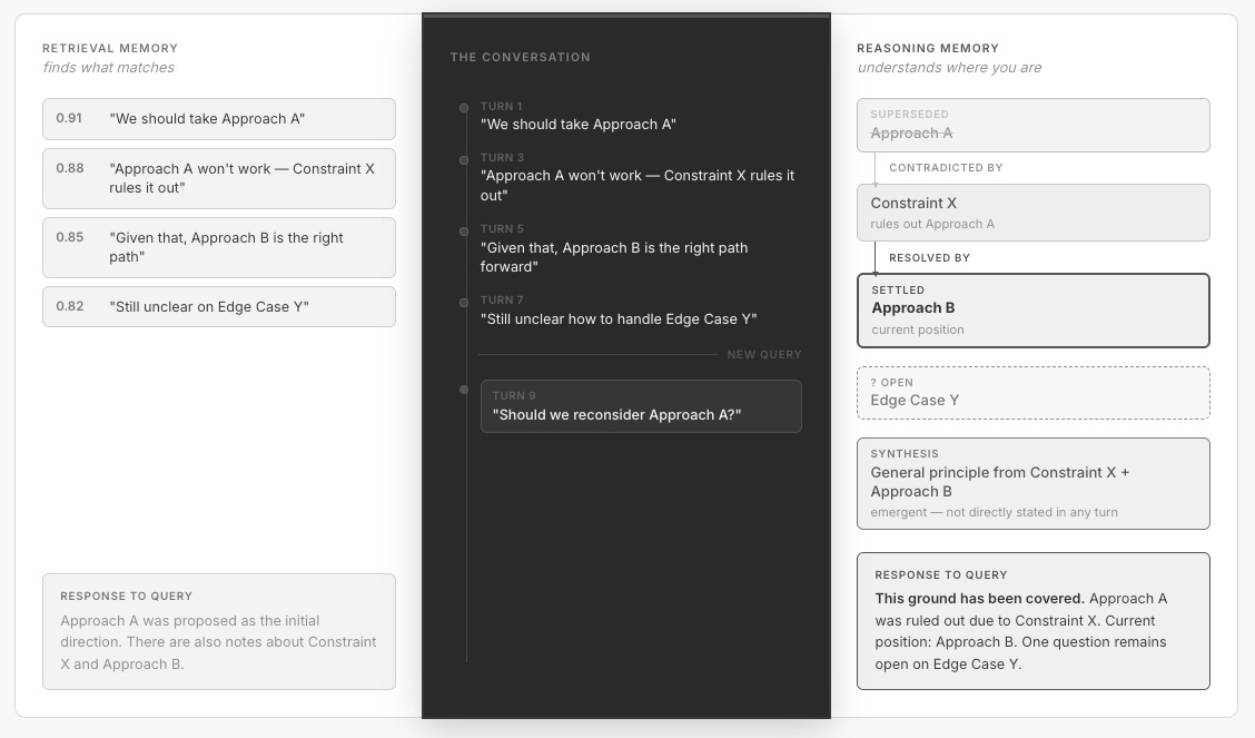 These are not competing approaches. Retrieval finds content. The reasoning graph provides orientation. The first tells you what was said. The second tells you where you are. A complete memory system needs both, and right now, only one of them exists as infrastructure.